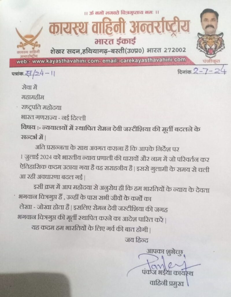 इसी क्रम में आप महोदया से अनुरोध ही कि हम भारतियों के न्याय के देवता भगवान चित्रगुप्त हैं, उन्हीं के पास सभी जीवों के कर्मों का लेखा – जोखा होता है। इसलिए रोमन देवी जस्टीशिया की जगह भगवान चित्रगुप्त की मूर्ती स्थापित करने का आदेश पारित करें। यह कदम हम भारतियों के लिए गर्व की बात होगी।