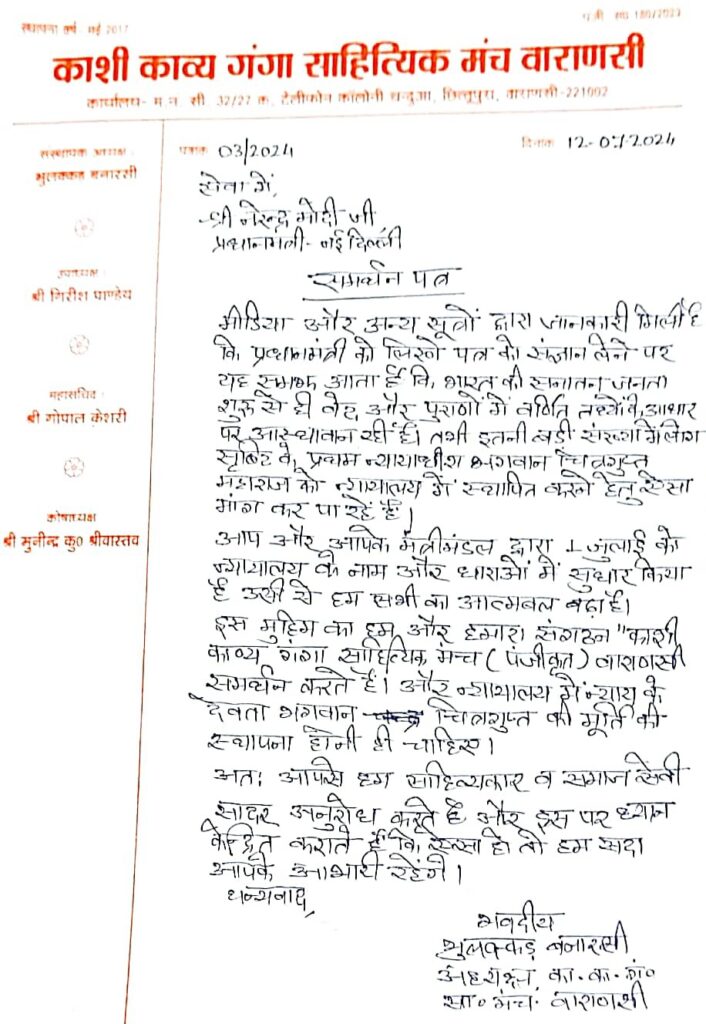 वाराणसी : कायस्थ वाहिनी अंतर्राष्ट्रीय के प्रमुख पंकज भैया कायस्थ के समर्थन में काशी काव्य गंगा साहित्य मंच के अध्यक्ष भुल्लकड़ बनारसी ने भारत के प्रधानमंत्री नरेन्द्र मोदी को पत्र लिखा ।