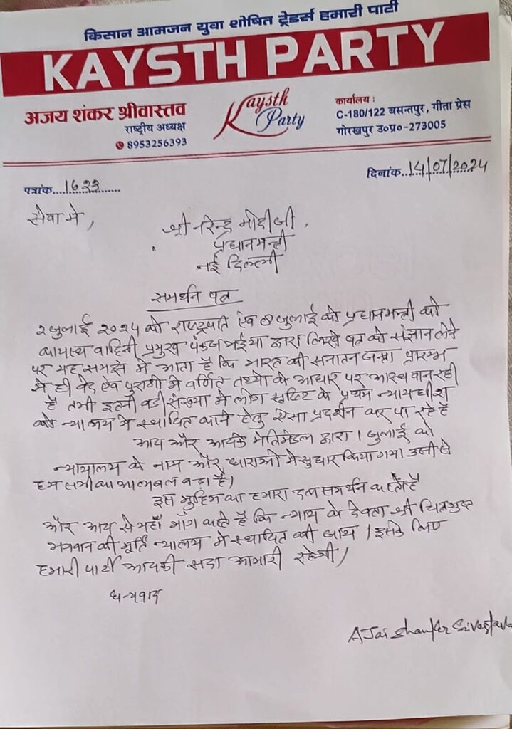 कायस्थ वाहिनी अंतर्राष्ट्रीय के प्रमुख पंकज भैया कायस्थ के समर्थन में कायस्थ पार्टी के राष्ट्रीय अध्यक्ष अजय शंकर श्रीवास्तव ने भारत के प्रधानमंत्री नरेन्द्र मोदी को पत्र लिखा ।