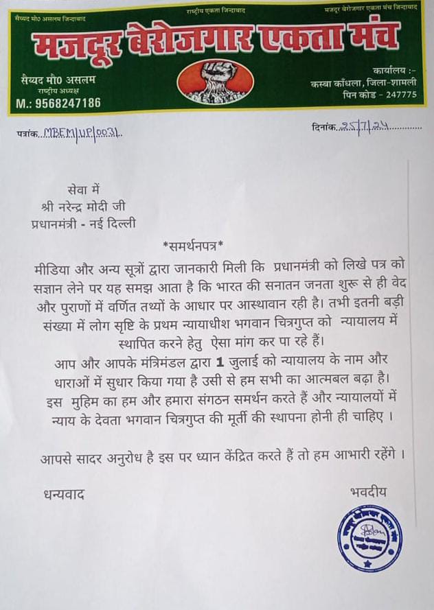 बस्ती : 25-जुलाई 2024 मजदूर बेरोजगार एकता मंच ने न्यायालयों में भगवान चित्रगुप्त की मूर्ति स्थापित करने का आग्रह किया।
