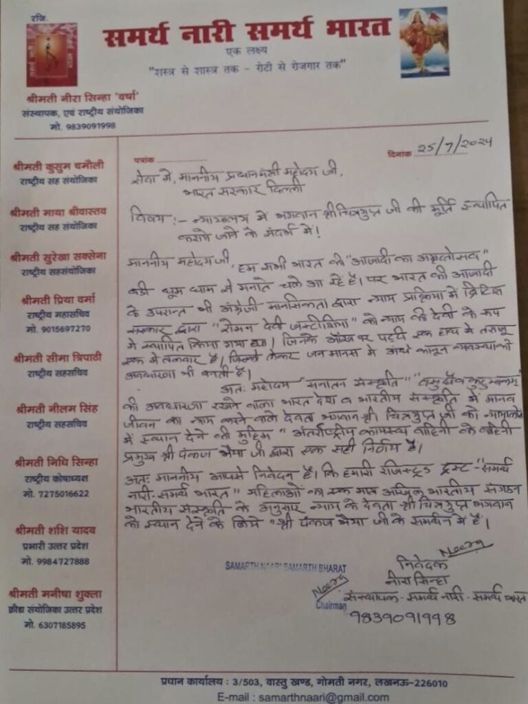 बस्ती : 26-जुलाई 2024 समर्थ नारी समर्थ भारत ने न्यायालयों में भगवान चित्रगुप्त की मूर्ति स्थापित करने का आग्रह किया।