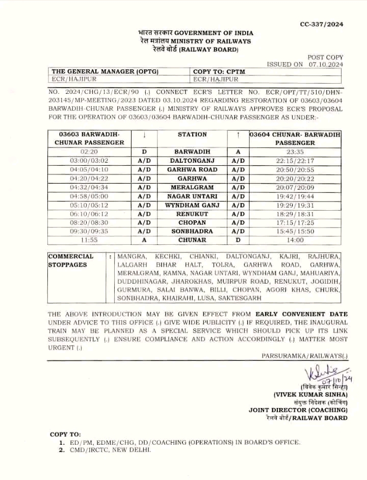 सोनभद्र : रेलवे की तरफ से यूपी के सोनभद्र और झारखंड के गढ़वा तथा पलामू जिलों के बाशिंदों के लिए बड़ी सौगात दी गई है।