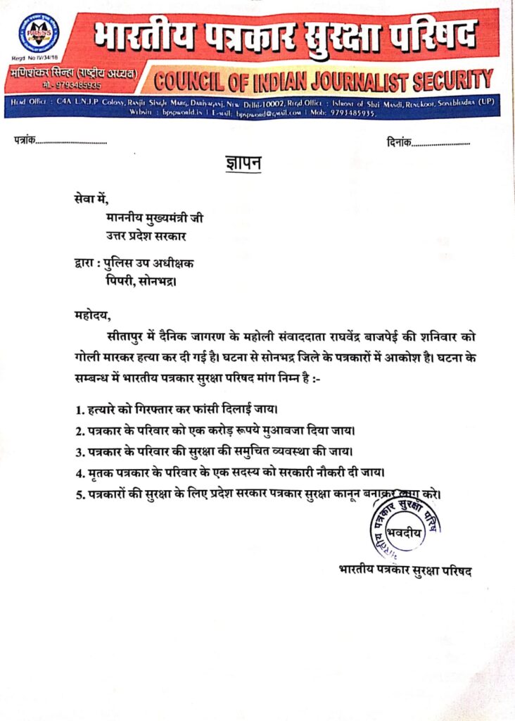 रेणुकूट (सोनभद्र) : सीतापुर के पत्रकार राघवेन्द्र वाजपेयी की हत्या के मामले में भारतीय पत्रकार सुरक्षा परिषद के पदाधिकारियों ने सोमवार को मुख्यमंत्री को संबोधित ज्ञापन सी ओ पिपरी को सौंपा।