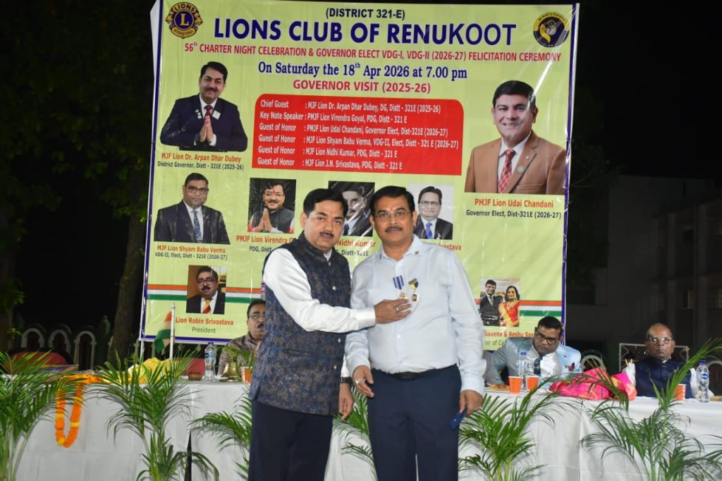रेणुकूट (सोनभद्र)। लायंस क्लब रेणुकूट द्वारा अपना 56वां स्थापना दिवस अत्यंत उत्साह एवं भव्यता के साथ मनाया गया। इस अवसर पर डिस्ट्रिक्ट गवर्नर लायन अर्पण धर दुबे मुख्य अतिथि के रूप में उपस्थित रहे। उनके साथ गवर्नर इलेक्ट लायन उदय चांदनी, वाइस डिस्ट्रिक्ट गवर्नर-2 लायन श्याम बाबू वर्मा, साउथ के गौरव एवं पूर्व जिला गवर्नर लायन वीरेंद्र गोयल (क्लब के गार्जियन स्वरूप), पूर्व गवर्नर लायन निधि कुमार तथा पूर्व गवर्नर लायन जेएन श्रीवास्तव की गरिमामयी उपस्थिति रही।